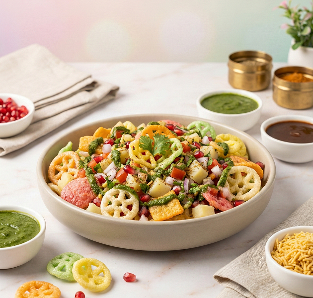 Fryums Chaat turns your favorite crispy fryums into a zesty, flavorful snack. With tangy chutneys, spices, and fresh toppings, every bite is a burst of fun and flavor!